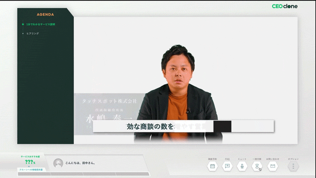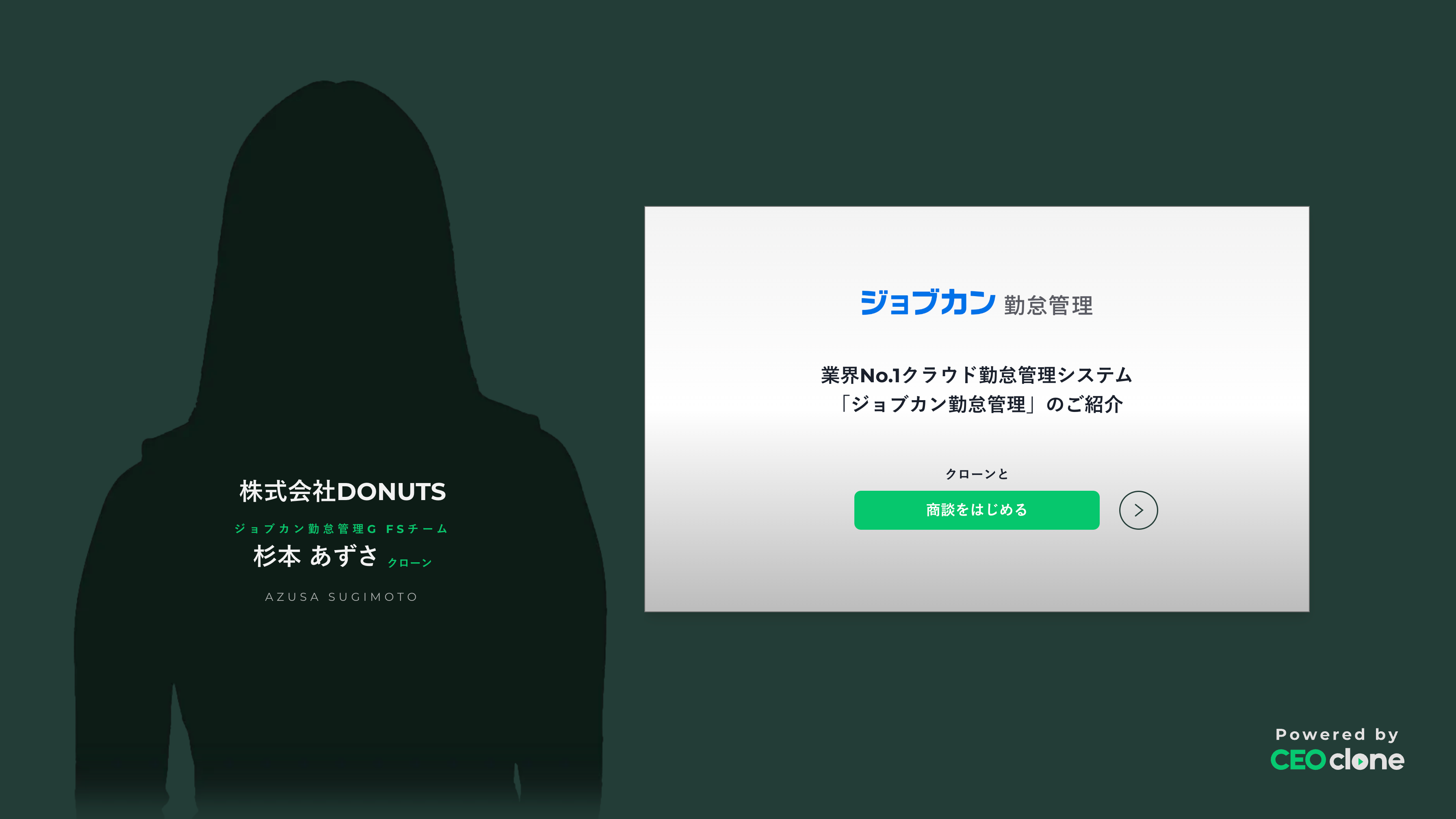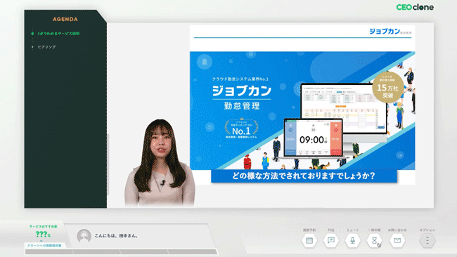 ジョブカンシリーズはバックオフィス業務のサポート範囲が広いため、サービス説明を含む1回の商談時間を短縮しづらく、お客様と営業担当双方の負担が懸念されていました。そこで、サービス説明部分については、トップセールスの営業クオリティを保ちつつ、場所や時間を問わず、お客様のペースで情報収集を行っていただけるようにという想いから「CEOclone」をご導入いただきました。