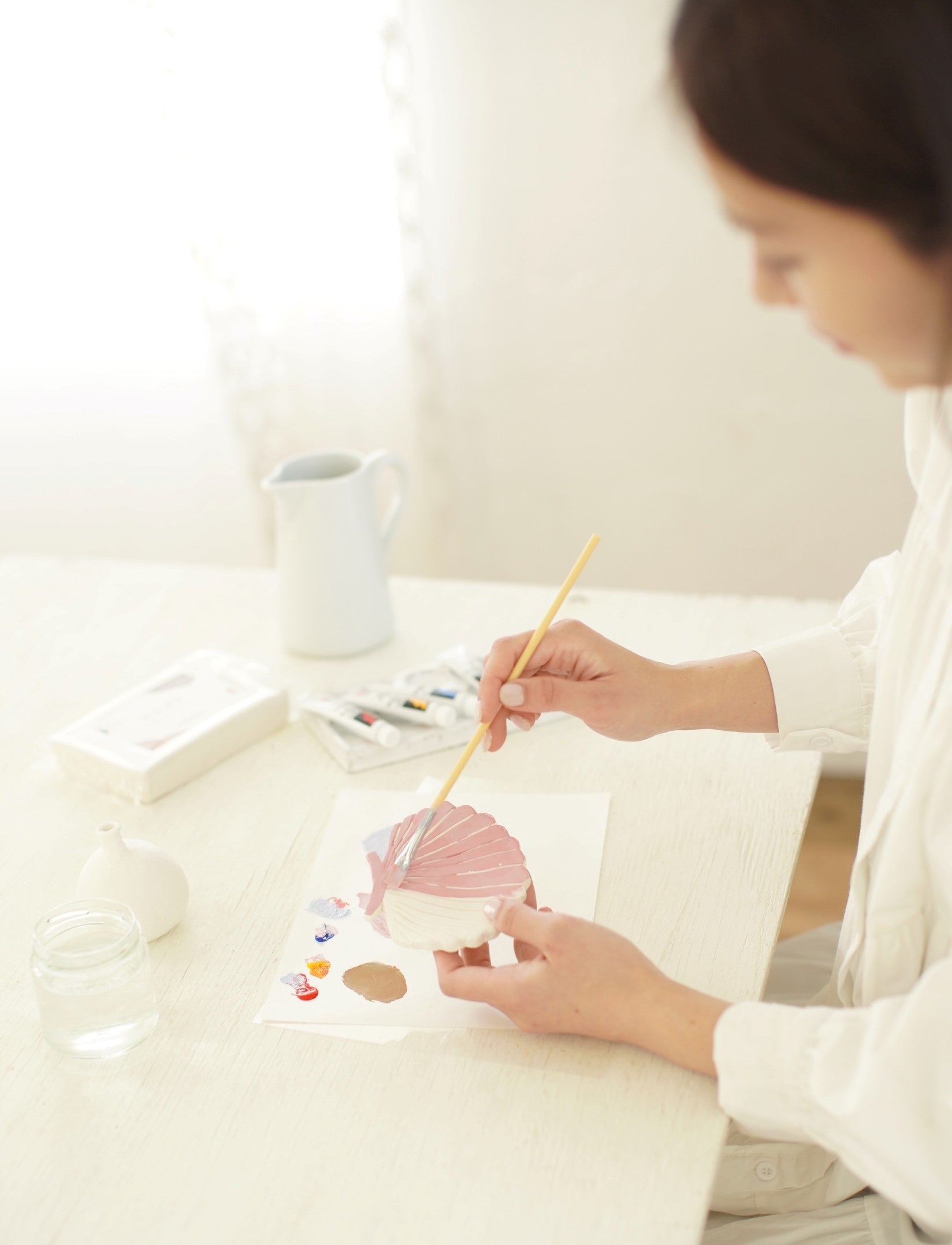 ヘラやのし棒などの基本ツールに加えて、目の粗さが異なる3種類のヤスリ、クレイがくっつかないようにシートに塗るオイル、フィニッシュをきれいに整えるコーディング剤など、作りやすく、きれいに仕上がる専用アイテムも入っています。画材はインテリアクレイに最もフィットする発色のアクリル絵の具をセレクトしました。