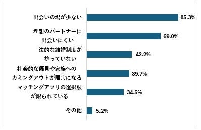レズビアンの当事者が恋愛やパートナー探しをする上で最も大きな課題として感じているのは、「出会いの場が少ない」ことで、85.3%もの方が回答しています 。これは、Q1の回答でイベントやアプリが主流であることが示唆されたものの、それでもなお「場」が不足しているという切実なニーズを反映しています。