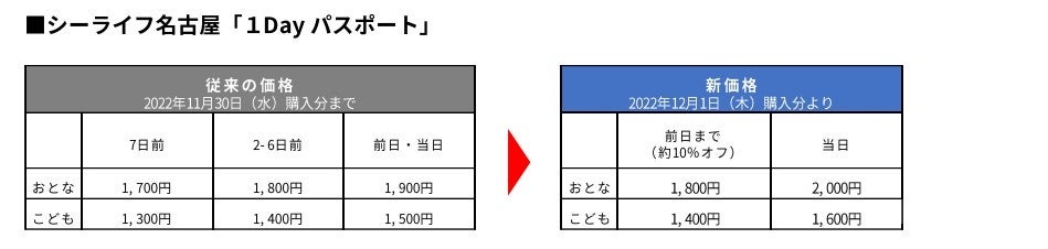 ・シーライフ名古屋「1DAYパスポート」の価格改定、他