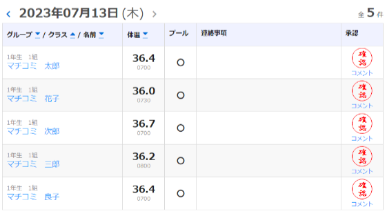 教職員は、保護者により登録された児童の体温やプールの参加可否を、管理画面からリアルタイムで確認することができます。従来の紙のプールカードのように、教職員が1枚1枚確認・押印をする必要がなく、手間の削減に繋がります。
