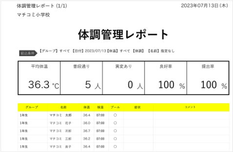 また、「児童の体調管理レポート」などを紙媒体で提出する際も、「マチコミ」画面から印刷するだけで簡単に作成することが可能です。