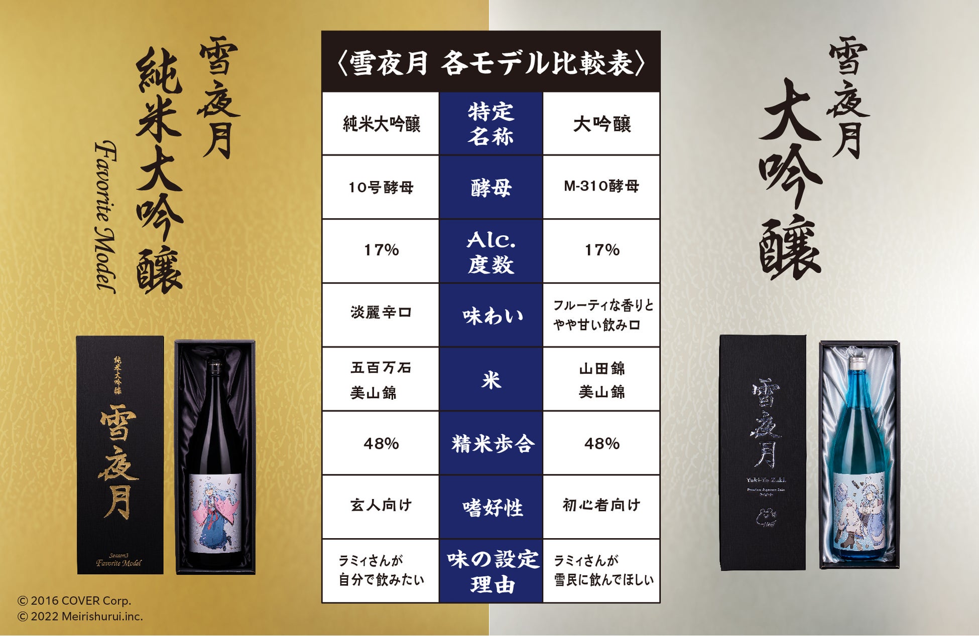 ‶大吟醸から純米大吟醸″に、酵母を‶M-310酵母から10号酵母″に、麹米を‶山田錦から五百万石″にそれぞれ変更し、米のうまみがしっかり感じられ、食中酒として晩酌を彩るのに最高の味わいになりました。雪花ラミィの好きな味わいをストレートに表現した一本。完全新作の「雪夜月Favorite Model」の味わいをお楽しみください。