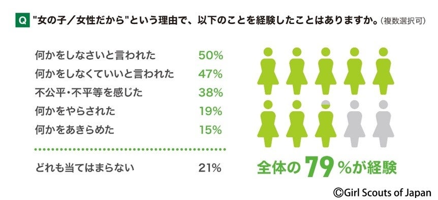 - "女の子/女性だから"という理由で、「何かをしなさい/しなくていい」などと言われたり何かをあきらめたりしたことがあると回答したのは79%