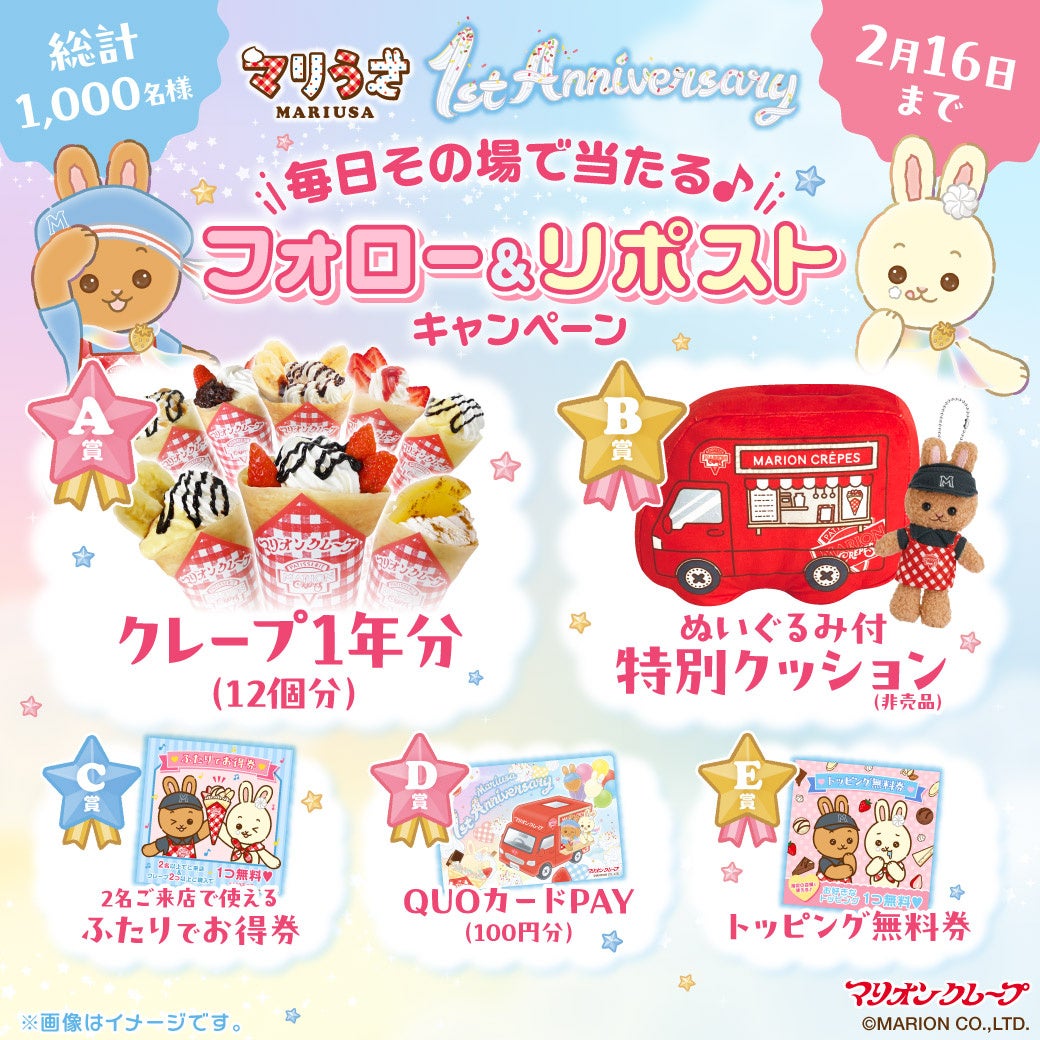 マリオンクレープ公式キャラクター「マリうさ」が1周年!“スイートジャーニー”で心温まる特別なひとときをお届け!ゆめかわな限定クレープやLINE着せ替え販売など、盛りだくさんのイベントを開催!