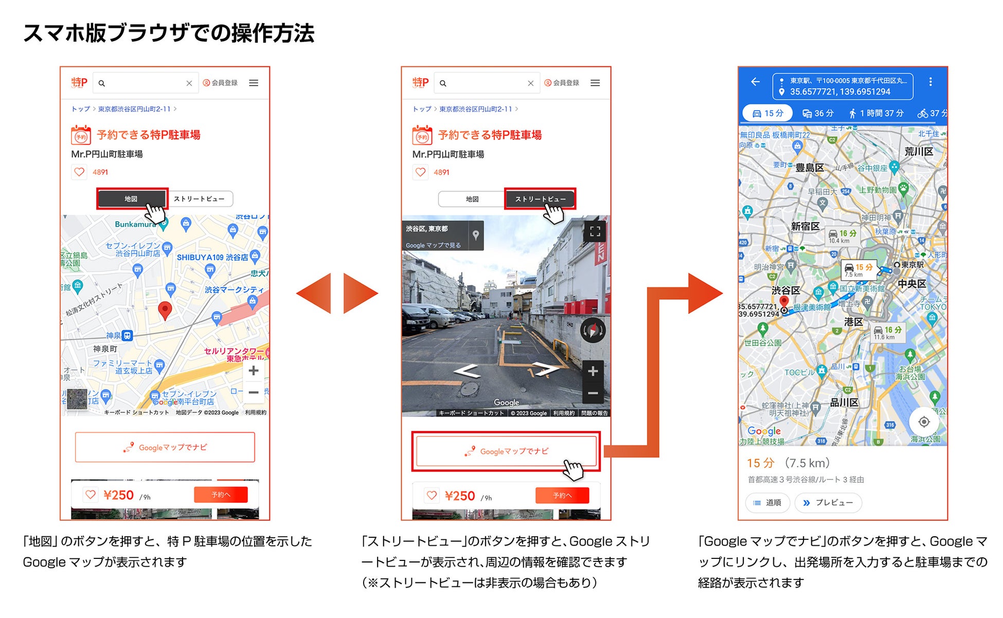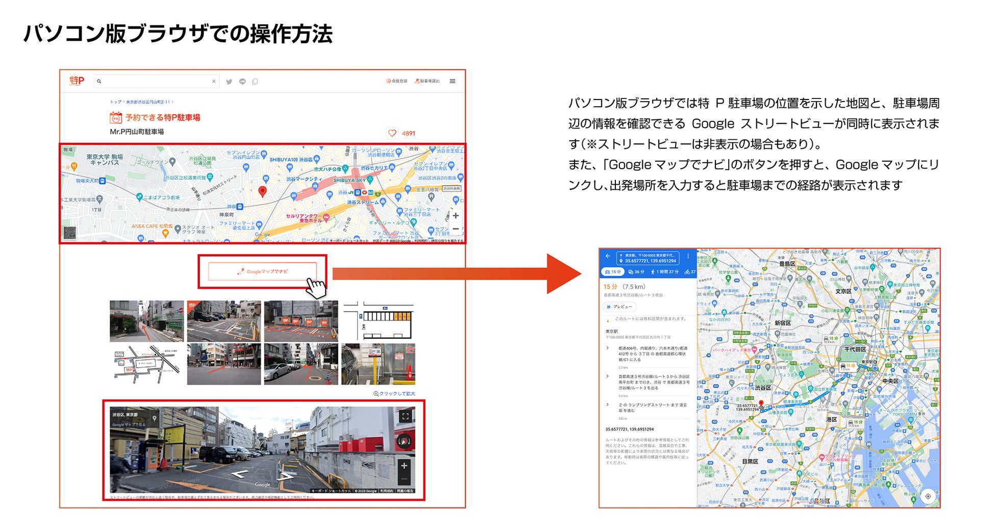 予約した駐車場までもう迷わない 業界初!特PにGoogleストリートビュー表示機能を追加
