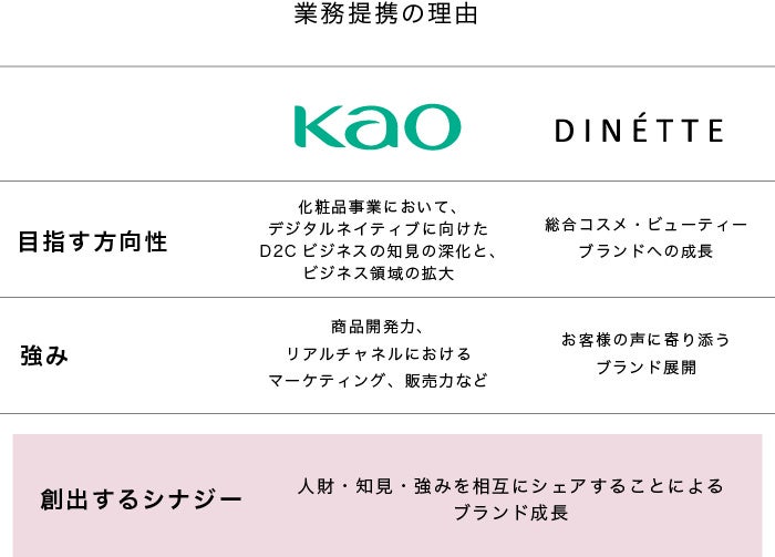 花王は、化粧品事業のパーパスとして「Celebration of Individuality~一人ひとりの人間を、その生き方を、讃える~」を掲げています。このたび、DINETTE社さまのミッション「Be”ME”「私らしく生きる」を叶える。」に賛同し、業務提携を開始することとなりました。DINETTE社さまの持つ、D2Cビジネスに関わる様々な知見やノウハウを学ばせていただきながら、同社の“美容メディア発のコスメD2Cビジネスモデル”の成長をサポートするとともに、世の中の人々がいきいきと輝く世界を一緒に創っていきたいと思います。