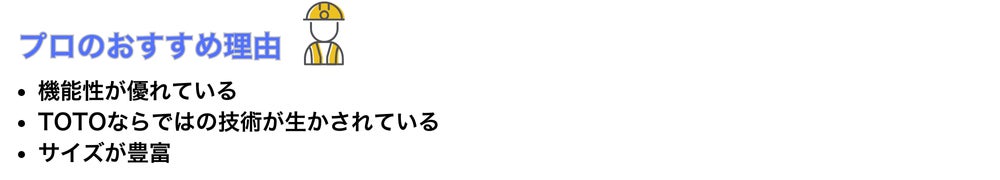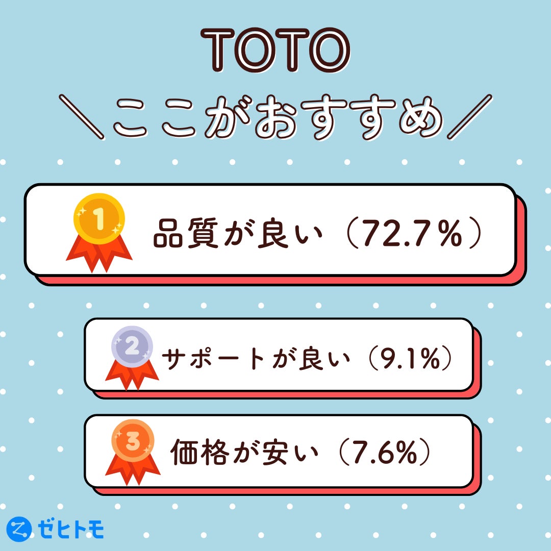 おすすめの理由として、TOTOは「品質の良さ」、LIXILは「価格の安さ」が最も多く挙げられました。別調査のトイレリフォームでも同様の順位ですが、選んだプロは異なるため、施工箇所によっておすすめのメーカーは変わることがわかります。