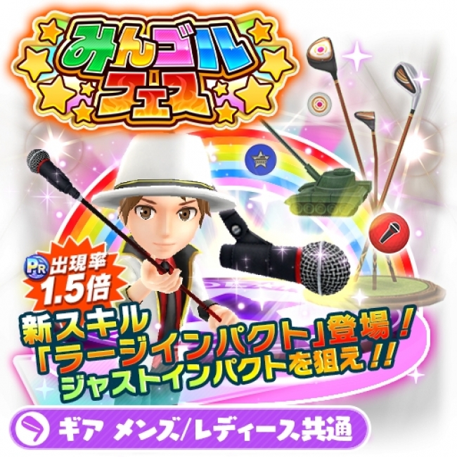 期間中、プラチナランク(PR)の出現確率が1.5倍になることに加え、「みんゴルフェス」限定のアイドルドレス・ジャケット・スタンドマイククラブなどのアイドルコーデができるアバター・ウェア・ギアが新登場!!また、新登場するギアは新スキル「ラージインパクト」がつきます。