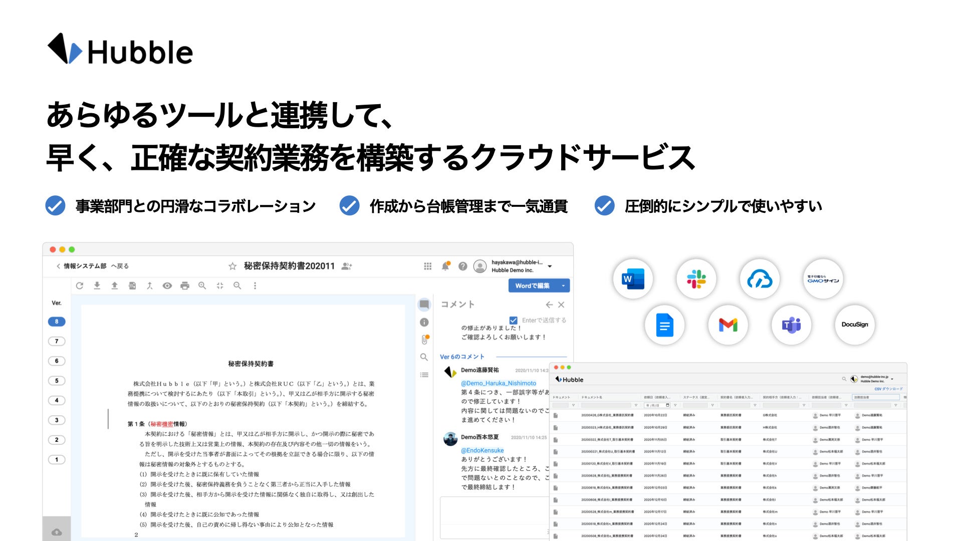 Hubble(ハブル)は、約150社1万人が利用する、“あらゆるツールと連携して、早く、正確な契約業務を構築する”クラウドサービスです。SlackやTeams、クラウドサインなどと連携しながら、契約業務を効率化し、契約書締結までのコラボレーションを最速化します。バージョン管理だけでなく、契約書締結後の管理も可能で、期限管理や検索機能も充実しており、契約データベースとしても強力です。