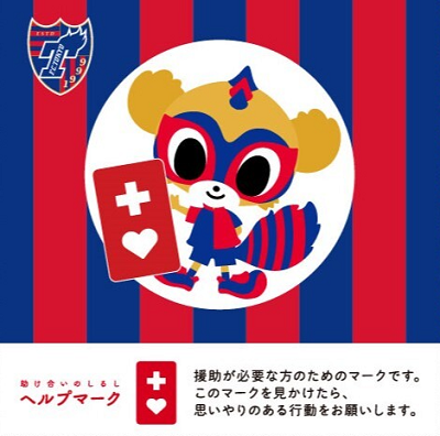 合計2000枚のオリジナルデザインのクロスも配布しました。FC東京のマスコットキャラクター「東京ドロンパ」とヘルプマークがコラボしたもので、中心にはヘルプマークを手にする東京ドロンパがプリントされ、背景は青と赤のFC東京カラーで彩られています。