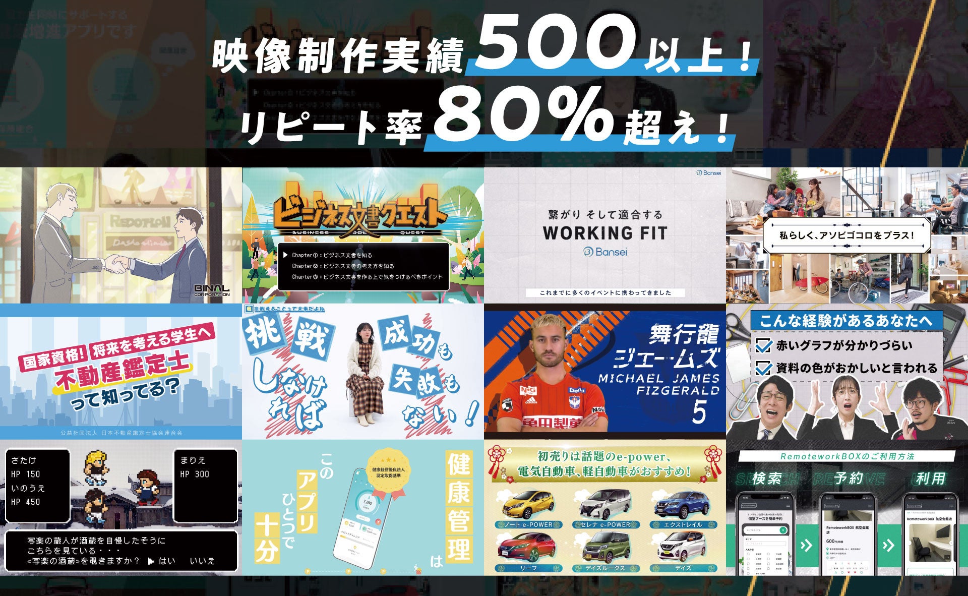 『動画制作』では、企業PR用TVCM、プロスポーツチームのPR映像、企業のサービス紹介アニメーションなど、高クオリティの映像を500本以上制作、クライアント様のリピート率も80%を超えております。