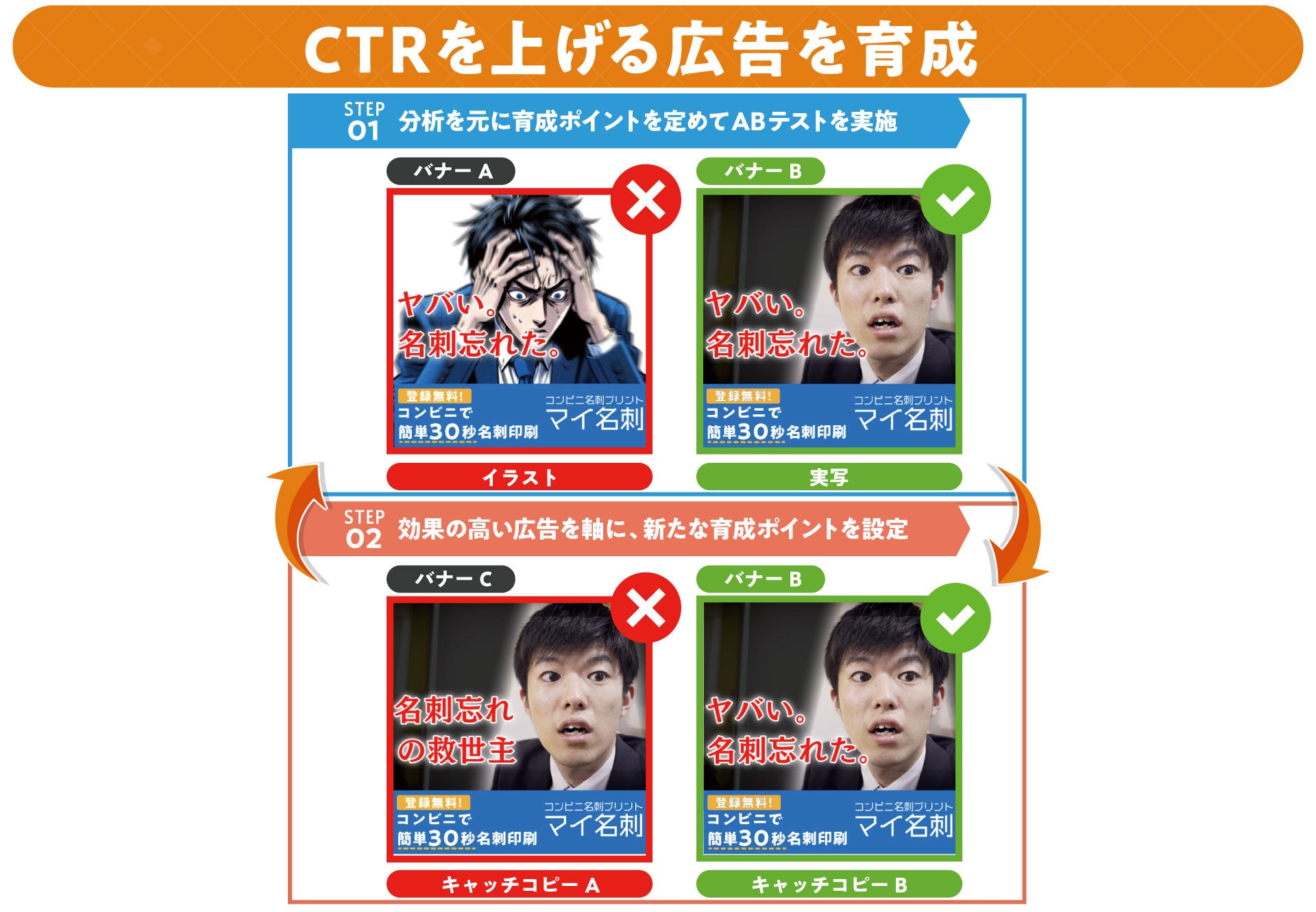 「どうすれば広告のクリック率が上がるのか」「どうすれば着地先(遷移先)のコンバージョンが上がるのか」などを、ABテストやPDCAを提案し続けることで、出稿効果を最大化することが『育アド』の最大の特徴です。
