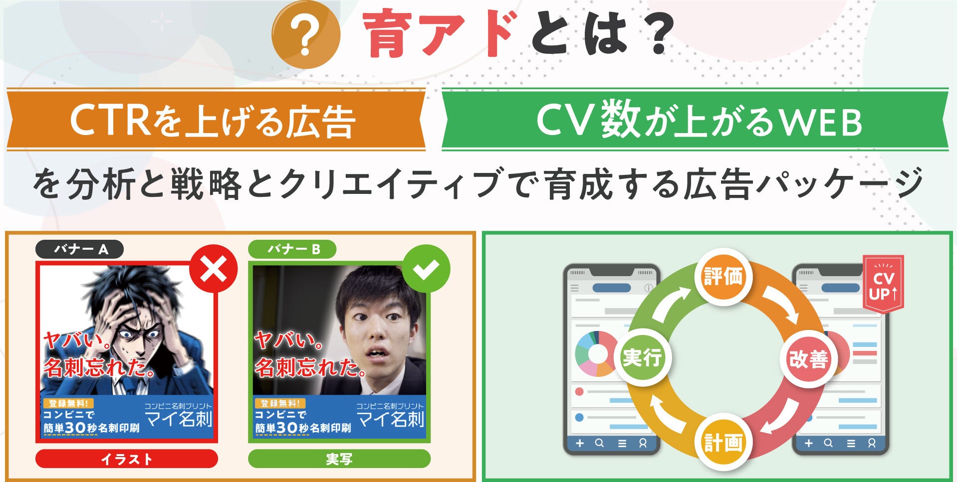 『育アド』では【アプリ広告の効果を高める】【広告の着地先であるWEBのCV率を高める】ことを『育成』と呼んでいます。