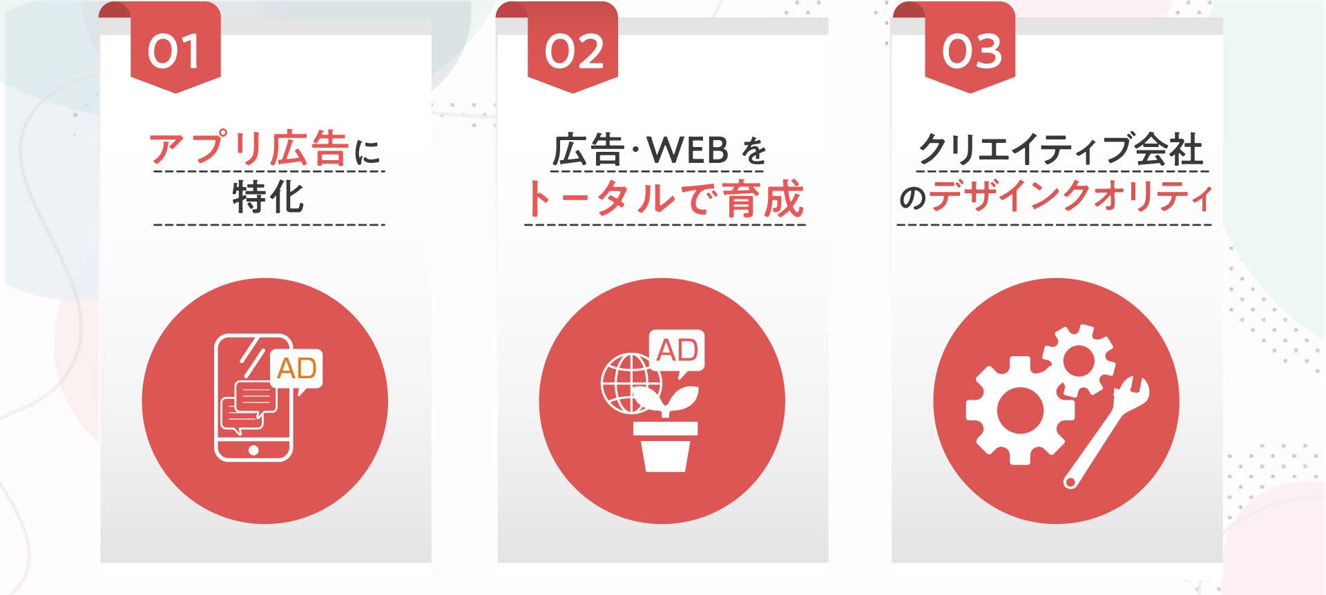 「広告効果を育成する」をコンセプトに、従来型の広告戦略に加えて、制作プロとして培ってきたクリエイティブのチカラで、着地先(遷移先)LPやWEB、アプリページなどとの親和性を高める提案を行うことで、広告効果を高め続ける(育成していく)サービスです。