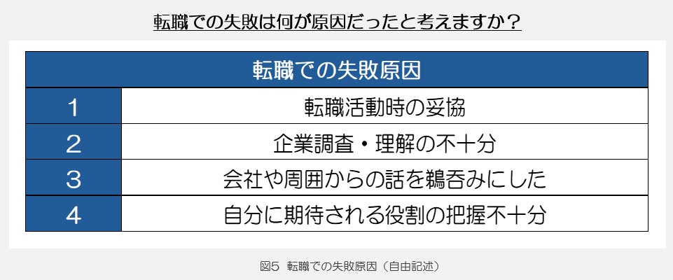 転職に失敗したのは何が原因だと考えるかをうかがったところ、大きくわけて「転職活動時の妥協」、「企業調査・理解の不十分」、「会社や周囲の話を鵜吞みにした」、「自分に期待される役割の把握不十分」の4つが挙げられました。
