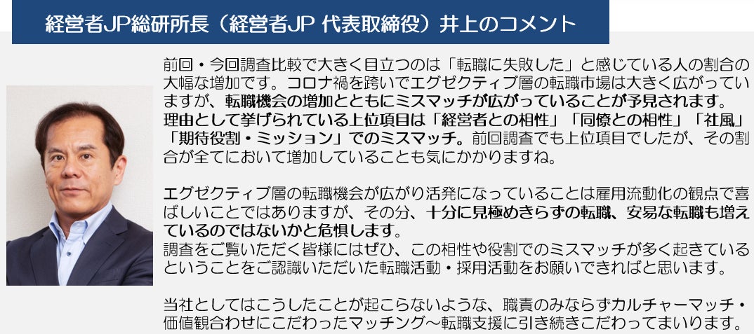 エグゼクティブ向けの転職・キャリア支援サービスを展開する株式会社 経営者JP(本社:東京都渋谷区 代表取締役社長・CEO 井上和幸)は、日ごろお付き合いのあるエグゼクティブ男女約3,500名(有効回答数 100名)を対象に、「転職での失敗」について、リアルな声をうかがいました。