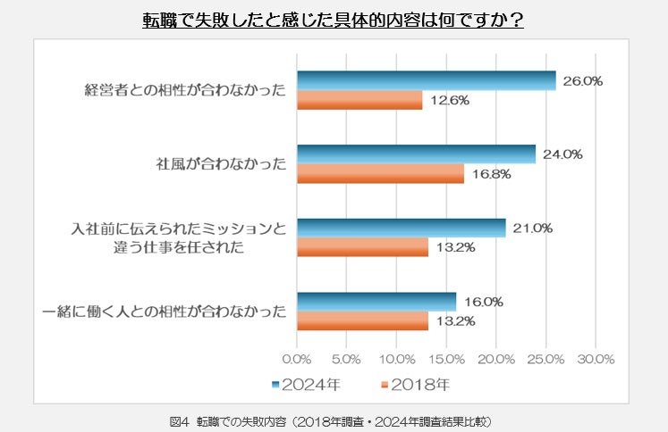 さらに、転職での具体的な失敗内容を2018年と今回2024年調査で比較したところ、上位4項目(「経営者との相性が合わなかった」、「社風が合わなかった」、「入社前に伝えられたミッションと違う仕事を任された」、「一緒に働く人との相性が合わなかった」)に変動はないことがわかりました。