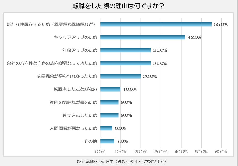 エグゼクティブの皆さんに、転職した際の理由をうかがったところ、「(異業種・異職種など)新たな挑戦をするため」が55.0%と最も多く、つづいて「キャリアアップのため」が42.0%、「年収アップのため」が25.0%という結果となりました。