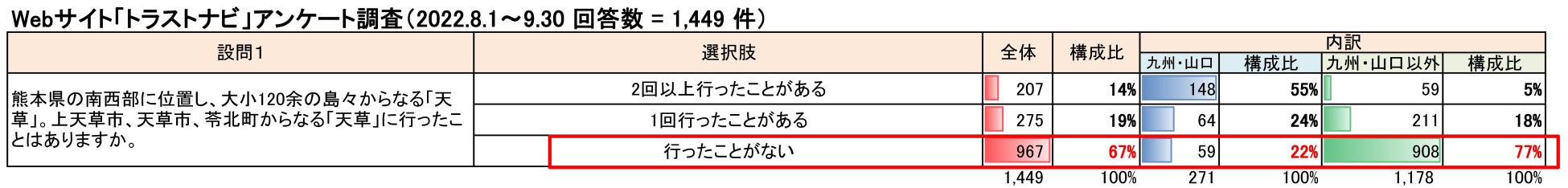天草に「行ったことがない」 = 全体67%(内訳:九州・山口在住=22%、九州・山口以外=77%)