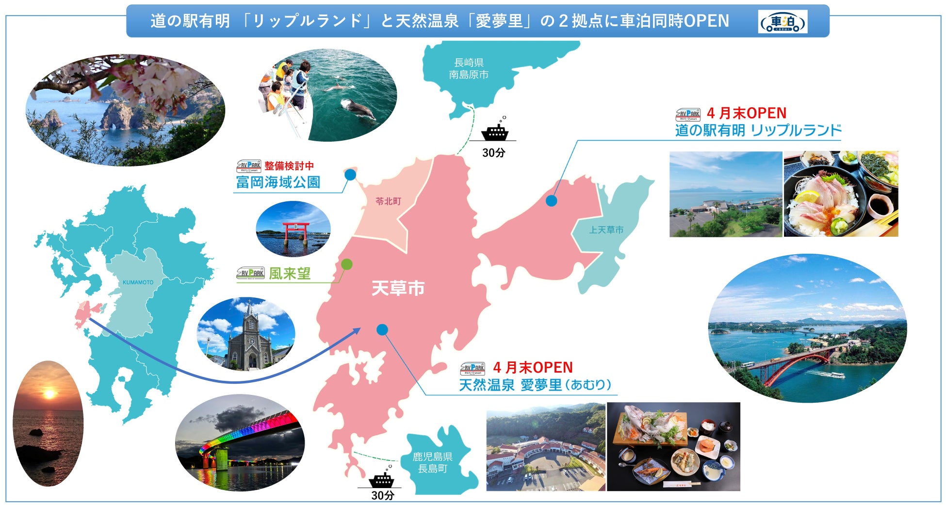 有明海と島原半島が望める道の駅有明「リップルランド」と、世界遺産の﨑津集落に近い天然温泉「愛夢里」の2施設で、2023年4月28日から車泊予約を開始いたします。