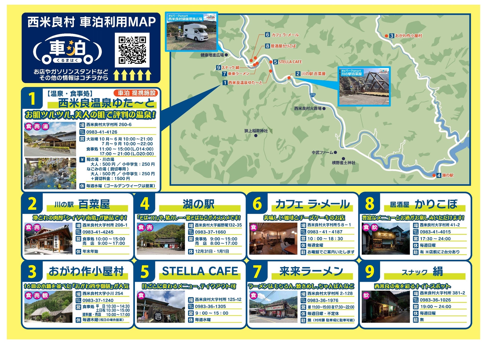 ※②)4月1日にオープンした宮崎県西米良村において、車泊周辺の飲食店を紹介しているチラシ。車泊予約サイトへの掲載、提携施設「西米良温泉ゆた~と」 にて来訪者に渡しています。