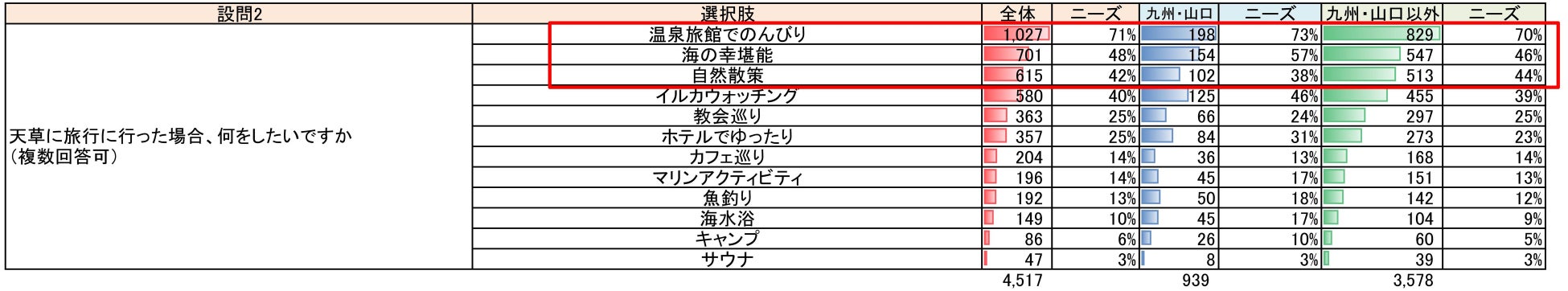 「天草で何をしたいか」については、上位ニーズを要約すると「天草の自然に癒され、温泉と海の幸を味わう、くつろぎの旅」を求めていることが分かります。