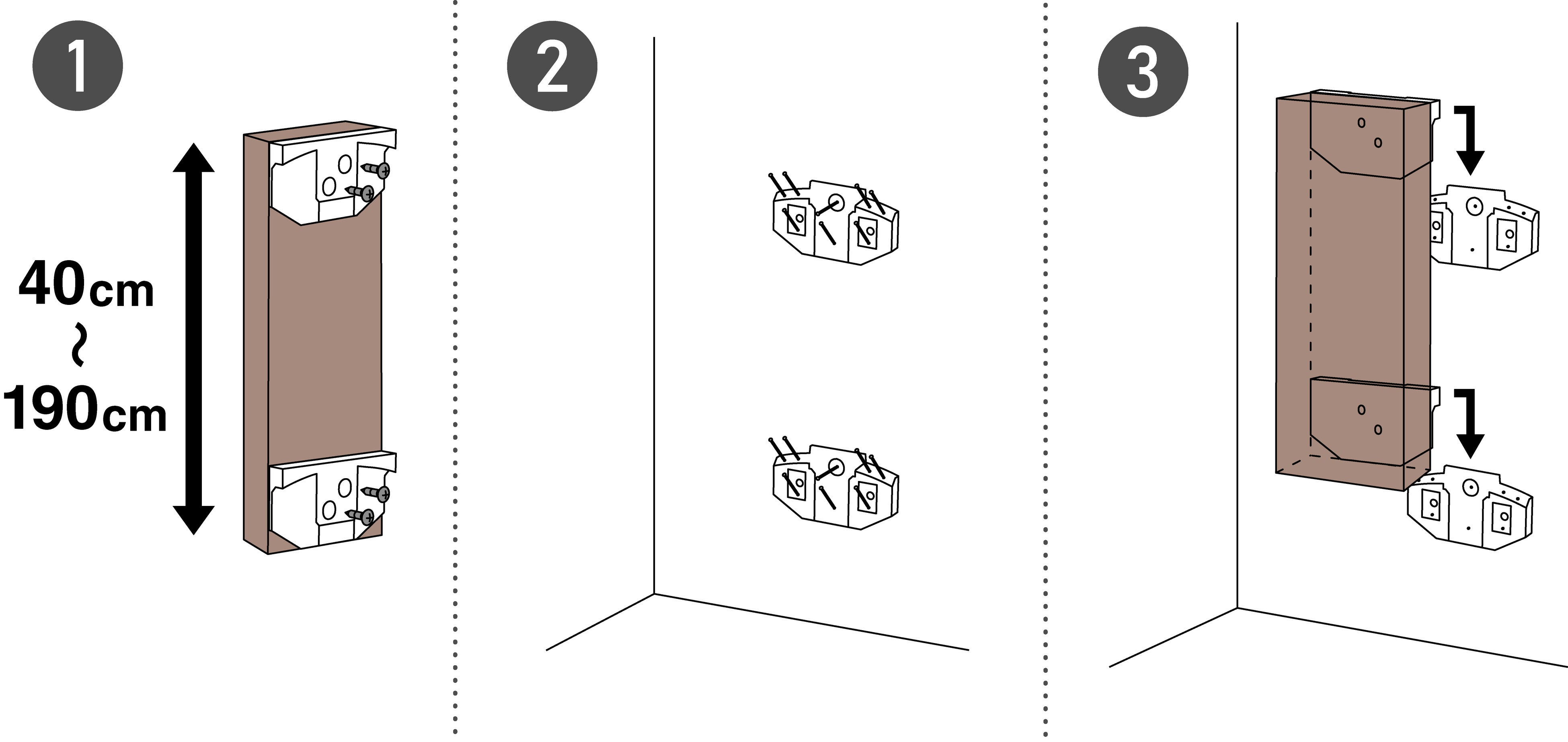 ➌柱材を壁側パーツに引っかければ取り付け完了です。