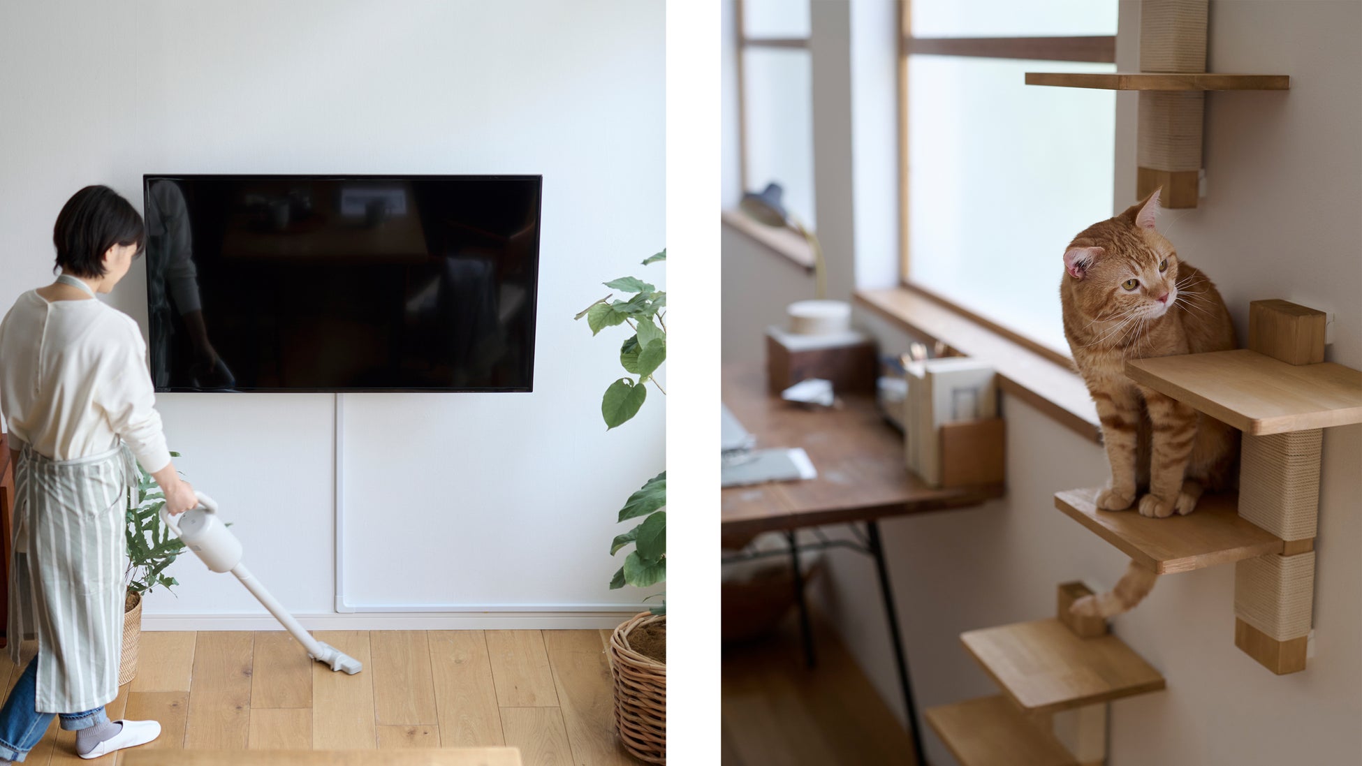 使い方次第ではテレビやキャットタワー、本棚なども浮かせて設置できるので、床がスッキリし、ロボット掃除機やフローリングワイパーを使った毎日のお掃除が楽になります。
