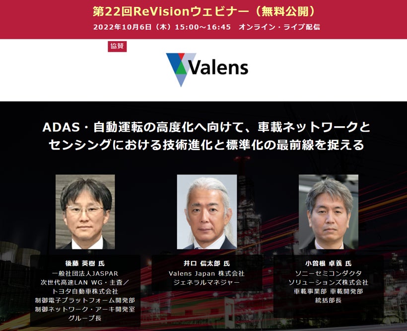 【無料WEBセミナー】 JASPAR/トヨタ、Valens、ソニーセミコンダクタソリューションズから講師を迎え、「車載ネットワークとセンシング」に関する講演・議論を無料ライブ配信 ― 10月6日(木)