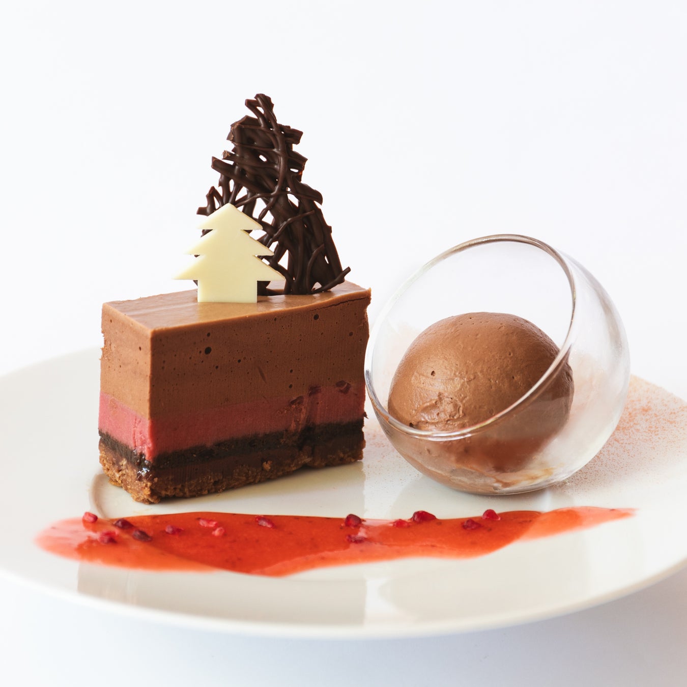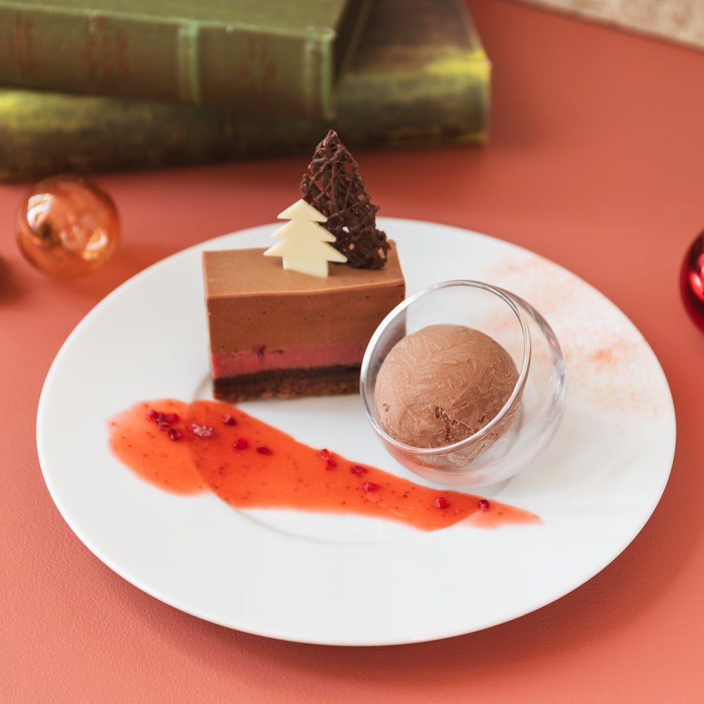 爽やかな風味と雑味のないタンザニア産カカオを使ったケーキと、ドミニカ共和国産のカカオを使用したチョコレートを、滑らかなアイスクリームに仕上げた1日数量限定の一皿です。ケーキは今年の新作クリスマスケーキ「Cacao du Noël」(※オンラインショップでは「クリスマスカカオ・タンザニア」)を特別におひとり様サイズにカットしてご用意。アイスクリームは、店舗併設のアイス工房でカカオ含有量60%のチョコレートにミルクを混ぜて作った優しい味わいです。お好みで自家製ストロベリーソースをつけてお楽しみください。(※1日数量限定、予約不可)