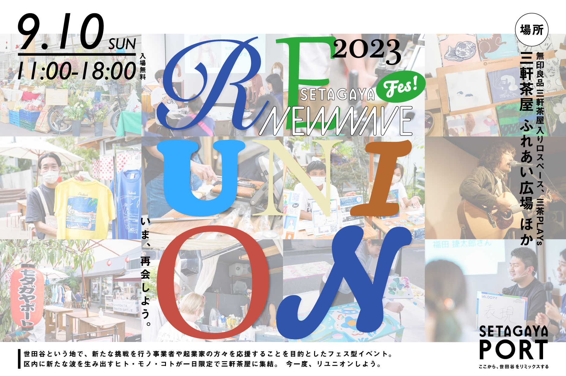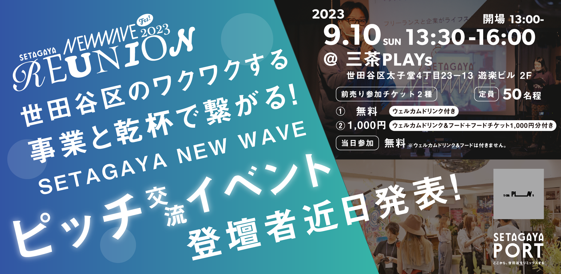 “ここから、世田谷をリミックスする”をコンセプトに、新たな産業の育成や、地域経済の活性化を目指してスタートした、産業創造プラットフォーム「SETAGAYA PORT」の取り組みの一つ。世田谷の新たなビジネスや若手起業家を応援することを目的に、今年度のNEW WAVEは「REUNION いま、再会しよう。」というコンセプトで、世田谷で挑戦する注目の事業者や起業家によるマーケットやピッチ交流イベントなどを実施いたします。