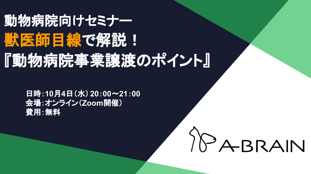 内容: 今回のセミナーでは、実際に経営する動物病院を譲渡した獣医師が、自身の経験や他病院の事例をもとに、譲渡を考え始めたきっかけや、獣医師のキャリアプランにおける事業譲渡の考え方などをご説明します。