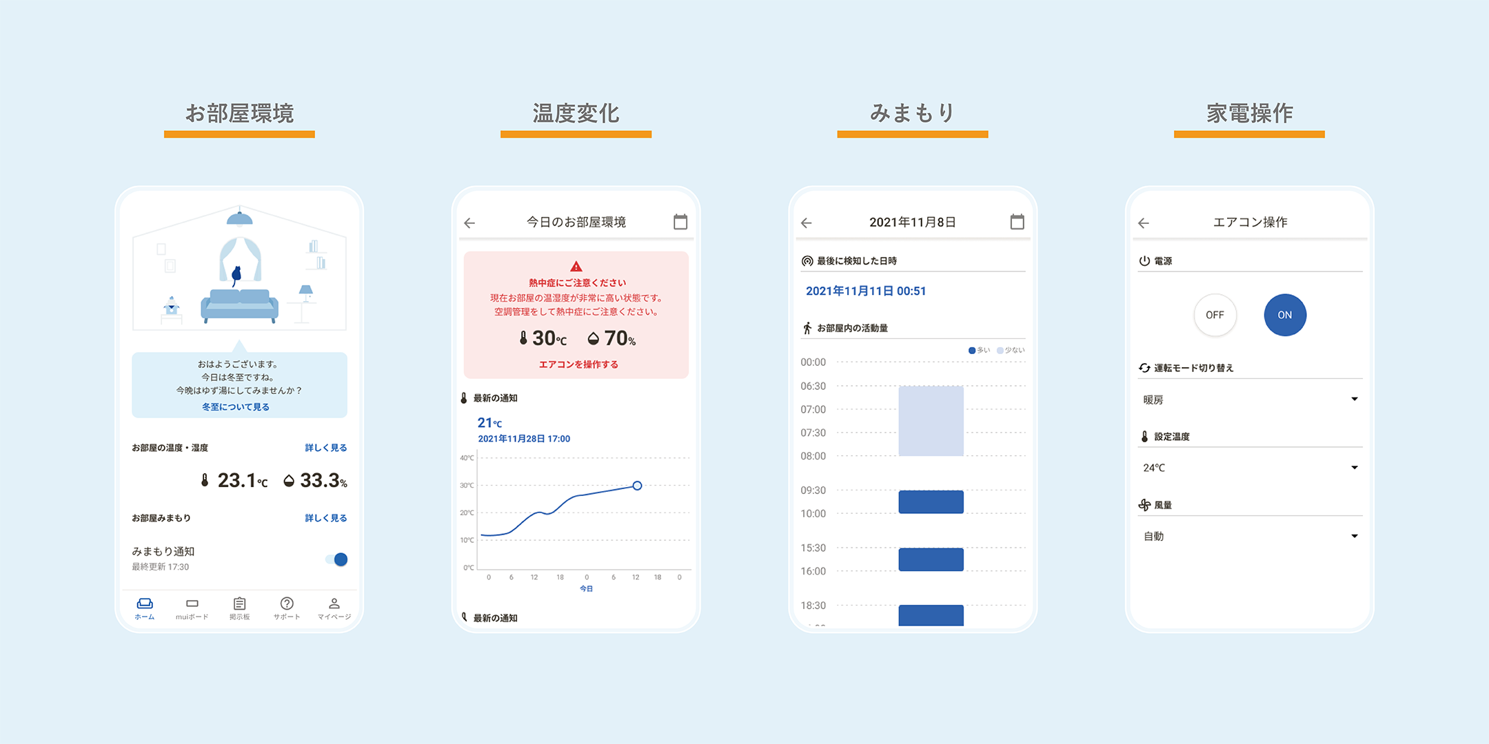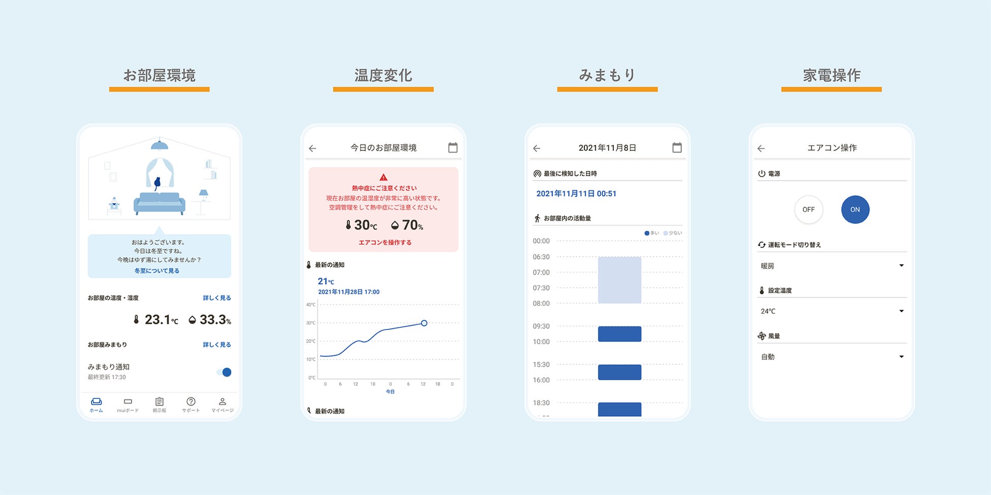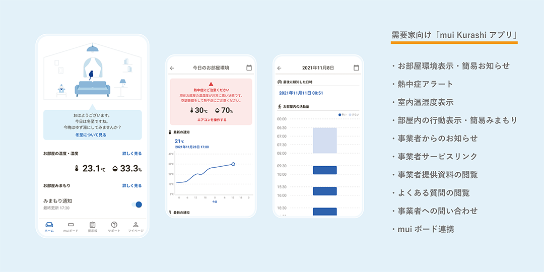 利用者は、「mui Kurashiアプリ」を利用することによって、室内の状態把握や電力会社とのコミュニケーションが可能です。アプリを活用して日々電力会社のサービスや情報に触れる中で、一方的で唐突なコミュニケーションになり兼ねない節電要請においても、日々の暮らしの延長線上で受け入れられ、穏やかな気持ちで最適な決断や行動をとっていただけるようになることを期待したサービスです。