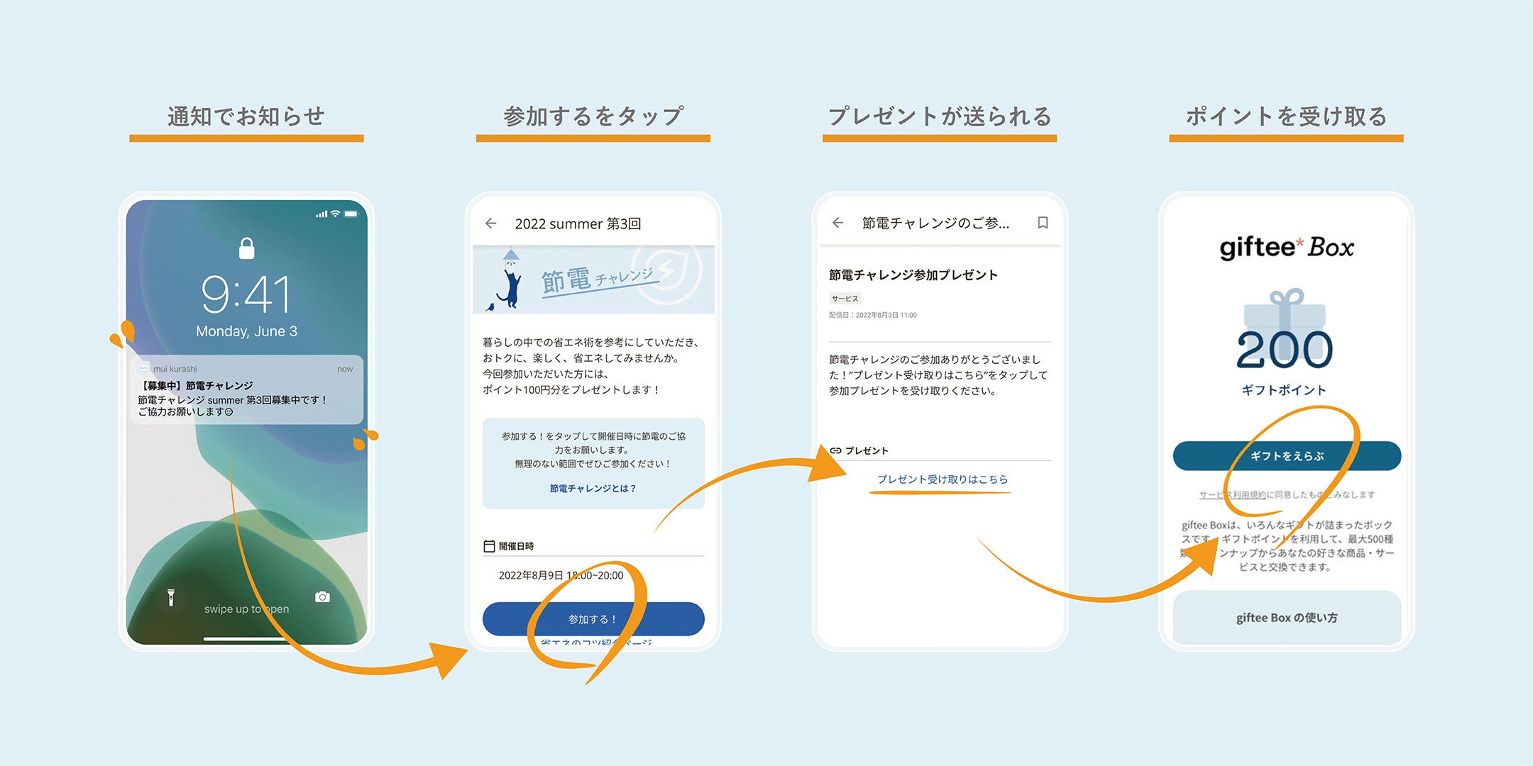 ・節電チャレンジへの参加に応諾をした方に「えらべるPay®」、また、期間終了後のアンケートに回答した方に「giftee Box®」を即時発行