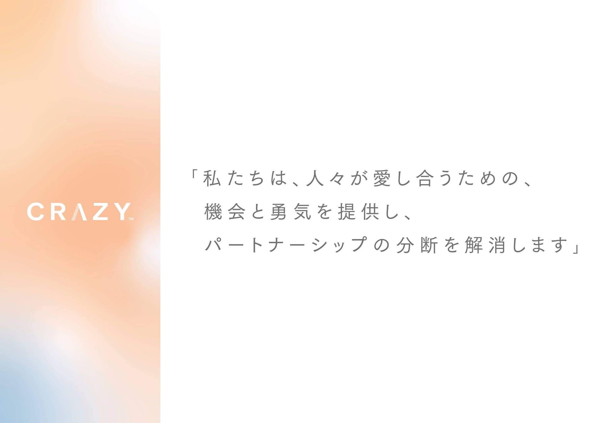 CRAZYは、「人々が愛し合うための、機会と勇気を提供し、パートナーシップの分断を解消します」をパーパスに掲げ、人が生きていくために必要な「愛」をベースに、経営に取り組んでいます。