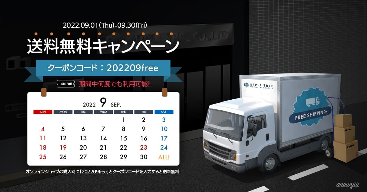 FLASHOFORGE公式オンラインストアで購入時、クーポンコード「202209free」を入力していただくと、送料を無料にさせていただきます。