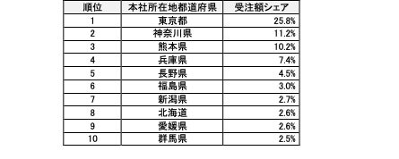 外部委託先の企業が本社を置く都道府県についても調査した結果、東京都が最も多く25.8%、次いで神奈川県が11.2%、熊本県が10.2%という結果となりました。全体でみると、東京都に本社を置く事業者が25.8%と約4分の1、一都三県に本社を置く事業者が39.7%、三大都市(東京都・大阪府・愛知県)に本社を置く事業者が27.4%を受託している実態もはじめて明らかになりました。