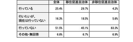 今回、地方移住の実態把握のための調査を行っているかどうかも調査しました。その結果、全体で移住関連調査を「行っている」自治体は25.4%(109)、「行いたいが、現在は行っていない」が16.3%、「行っていない」が51.5%、「その他・無回答」が6.8%となりました。この結果から、地方移住の実態把握のための調査を行っている自治体は25.4%に留まることが明らかになりました。