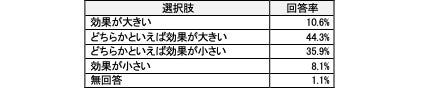 移住促進施策に取り組む自治体に「移住促進施策の効果の大小」を尋ねた結果、効果が大きいと感じている自治体が10.6%、どちらかというと効果が大きいと感じている自治体が44.3%、どちらかというと効果が小さいと感じている自治体が35.9%、効果が小さいと感じている自治体が8.1%という結果となりました。