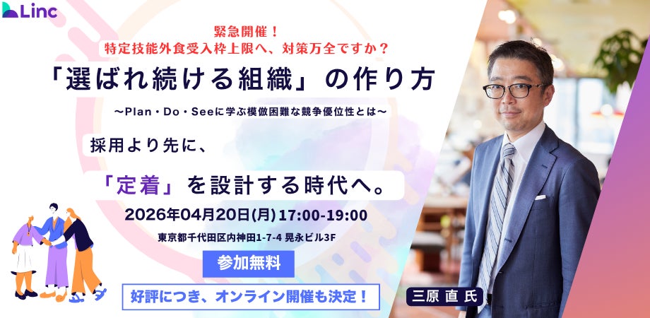 「日本に来てよかった」を最大化することをミッションに、外国人材の採用・定着支援AIプラットフォーム「Global Hub(グロハブ)」を展開する株式会社Linc(本社:東京都千代田区、代表取締役:仲 思遥、以下「当社」)は、2026年4月20日(月)、数多くの人気ホテル・レストランを運営する株式会社Plan・Do・Seeの新卒第1期生であり、同社を「Great Place to Work® 日本TOP3」へと導いた三原直氏を招聘し、サービス業における本質的な組織変革をテーマとしたセミナーを開催いたします。