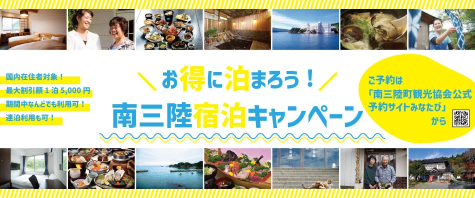 1泊最大5,000円割引、日本どこからでも利用可能。「お得に泊まろう!〜南三陸宿泊キャンペーン〜」でのご予約、ご滞在は期間中何日でも何度でもご利用いただけます。