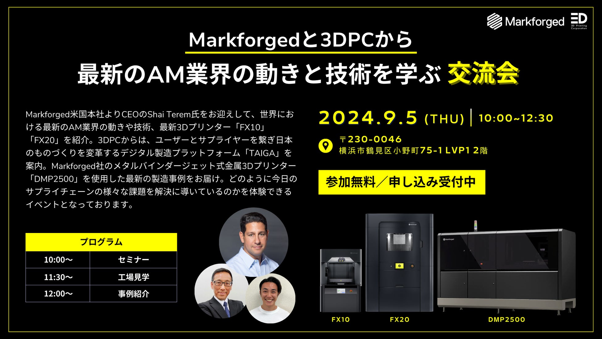 Markforged米国本社よりCEOのShai Terem氏をお迎えして、世界における最新のAM業界の動きや技術をご紹介いたします。同社の最新3Dプリンター「FX10」の新たな機能の発表や、最新の耐熱スーパーエンプラPEKK素材「Vega™」に対応する3Dプリンター「FX20」もご案内。さらに、3DPCからは先日リリースした、ユーザーとサプライヤーを繋ぎ日本のものづくりを変革するデジタル製造プラットフォーム「TAIGA」を紹介。TAIGAサプライヤーからゲストスピーカーを迎え、Markforged社のメタルバインダージェット式金属3Dプリンター「DMP2500」を使用した最新の製造事例をお届けします。