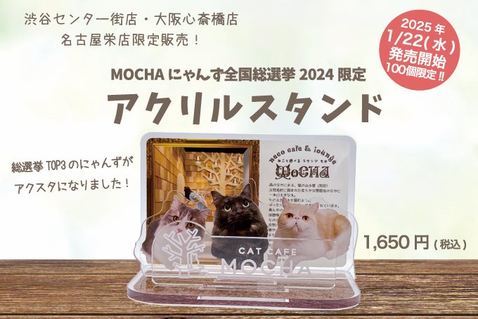 今回、2024年9月1日から10月14日に行われた「MOCHAにゃんず総選挙2024」では、予選と本選を合わせて10万票を超える投票が集まり、大変な盛況を収めました。その中で見事TOP3に輝いたにゃんずの待望のグッズ化が決定。アクリルスタンドとして100個のみの数量限定で販売いたします。また、販売はTOP3が所属する店舗(渋谷センター街店・名古屋栄店・大阪心斎橋店)のみで行われます。この特別なグッズをぜひ実際にご覧いただき、手に取ってお楽しみください。