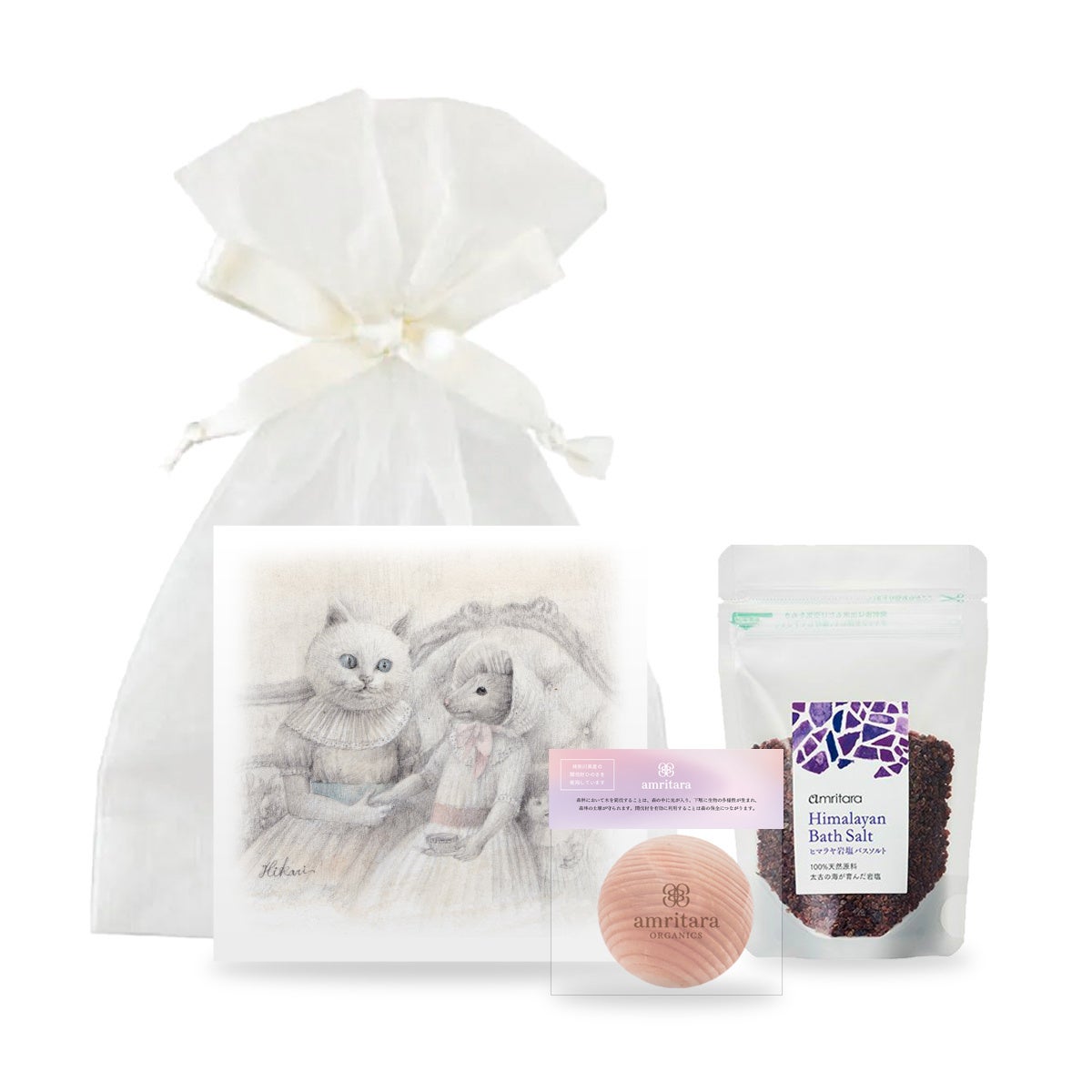 今回の寄付アイテムは小田原のヒノキの間伐材を使って作った「ストレッチボール」と自宅で温泉気分が味わえるアムリターラで大人気の「バスソルト」をセットにしたリラクゼーションアイテムに、美術家の日香里さんの猫の絵のポストカードが付いています。