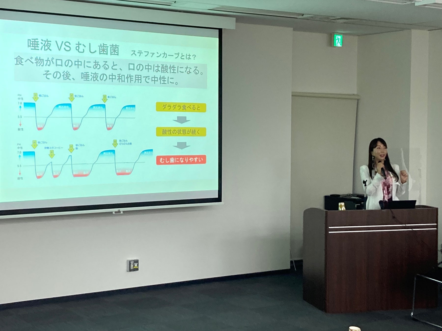 当社からは、ロイテリ菌の菌株の種類や、むし歯・歯周病・夜泣き改善等の結果がある臨床研究実績について説明しました。さらに、より効果を最大限にするために必要な食事・運動・睡眠、前向きにリラックスした生活を送る心の健康の大切さを伝え、『肉体的・精神的・社会的に人間を支えるのは、お口と腸。その働きを助ける乳酸菌が、ロイテリ菌で、皆さんの真の健康長寿の実現をしたいと思っています。』と話しました。