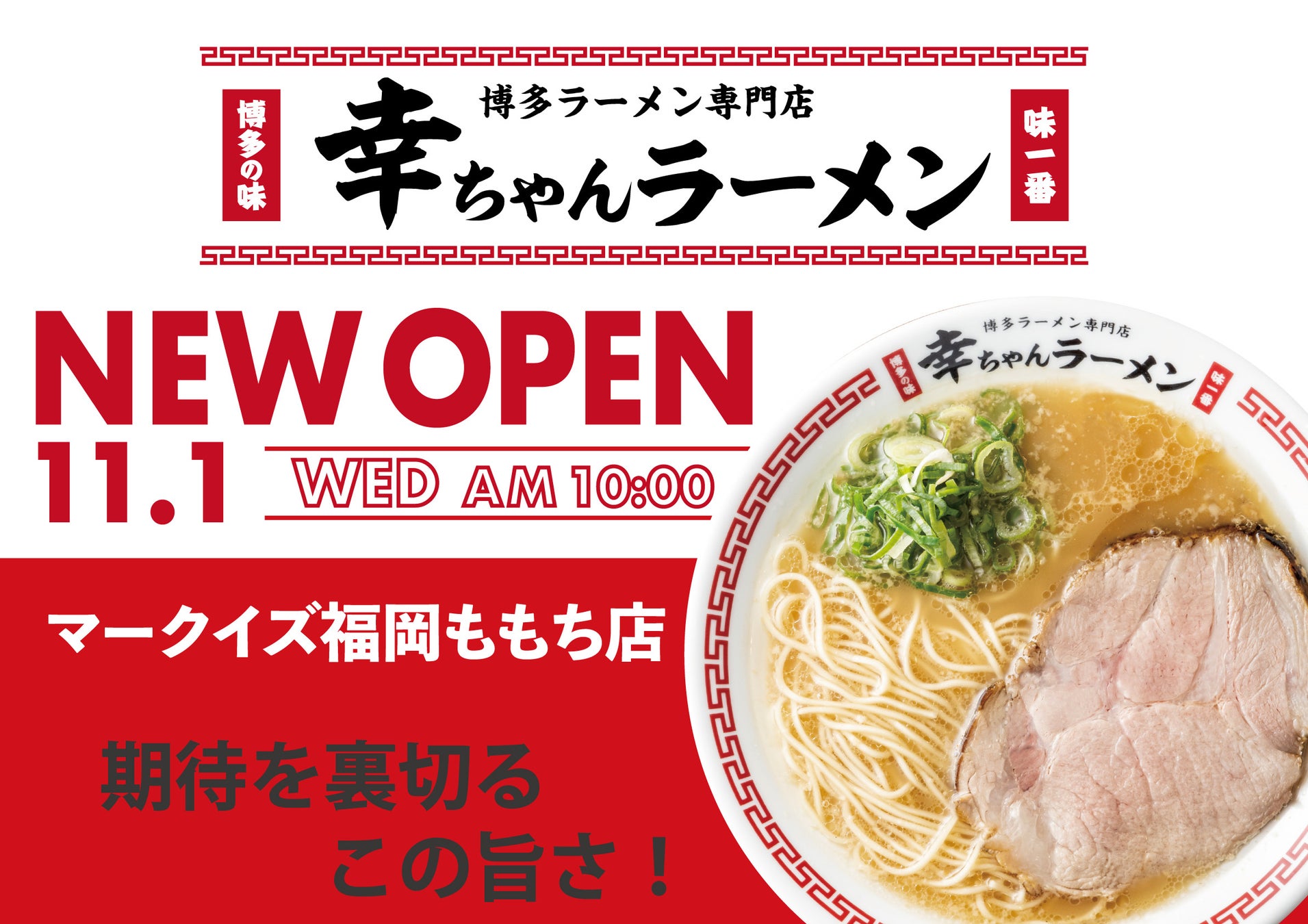 株式会社ウインズジャパンホールディングス(所在地:福岡県福岡市博多区、代表取締役社⻑:吉村幸助)は、2023年11月1日(水) 10:00に博多ラーメン専門店『幸ちゃんラーメン マークイズ福岡ももち店』を福岡県福岡市地行浜にある三菱地所運営の商業施設 マークイズ福岡ももち 3Fのフードコート内に出店いたします。元祖泡系 『博多一幸舎』がプロデュースする『幸ちゃんラーメン』の10店舗目です。