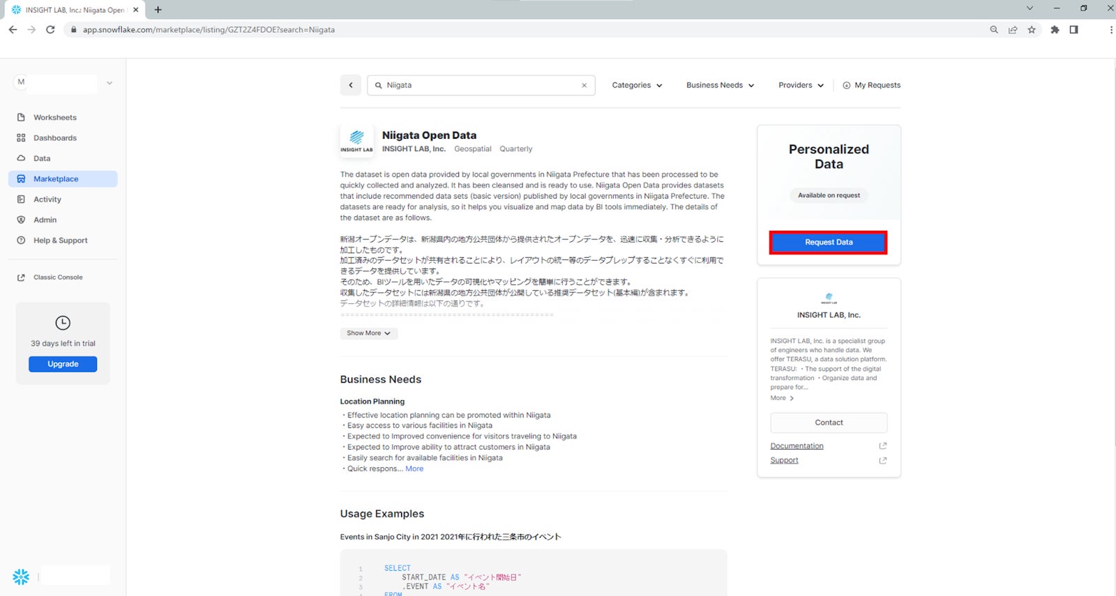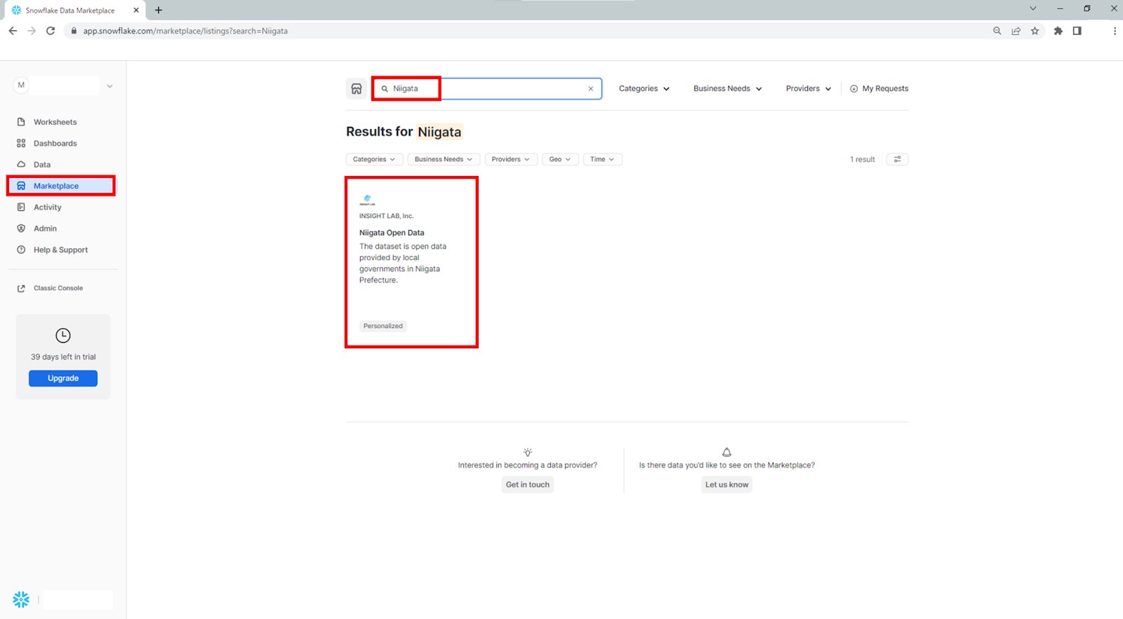 Snowflakeのアカウントをお持ちの方はSnowflake マーケットプレイスにて"Niigata"で検索、申請を行ってください。