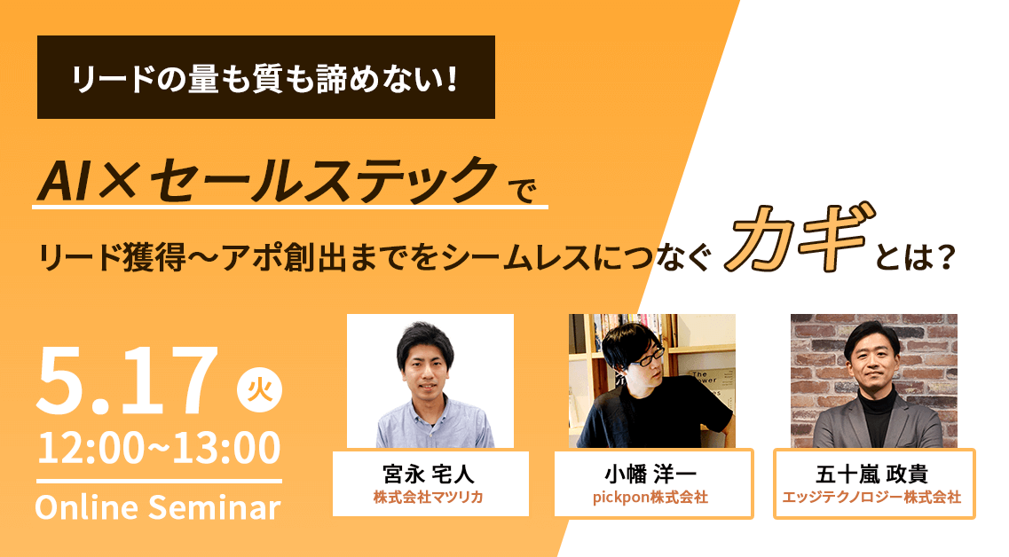 | 登壇者 | 株式会社マツリカ インサイドセールスマネージャー 宮永 宅人 エッジテクノロジー株式会社 AIプロダクト事業部 エヴァンジェリスト 五十嵐 政貴 pickupon株式会社 代表取締役 小幡 洋一 |