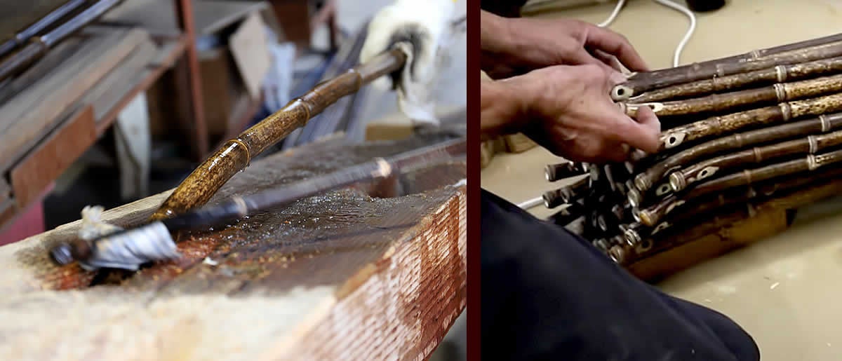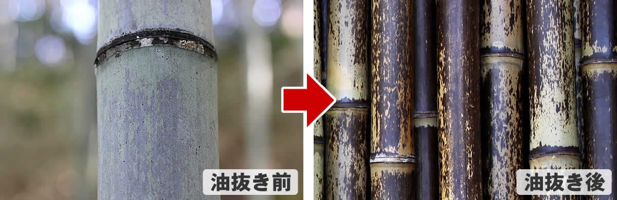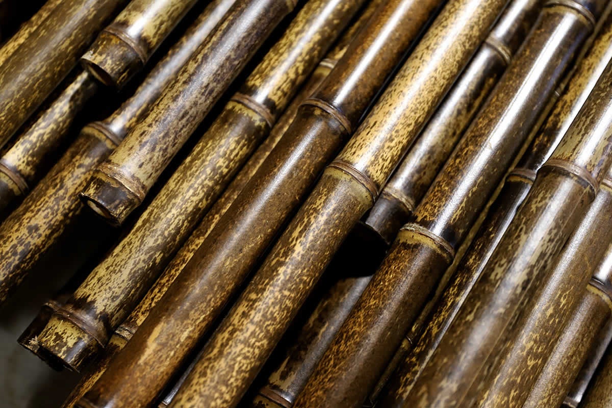 虎斑竹の特徴は表皮に浮かぶ虎模様ですが、油抜きをする事によりその模様がより鮮明に浮かび上がります。油抜きはガスバーナーを用いた乾式油抜きと熱湯を用いる湿式油抜きの2つの方法がありますが、虎斑竹の場合には乾式油抜きを行います。大型ガスバーナーの700度の炎で炙る時間は、竹の太さや乾燥具合などに合わせて調整しており、油抜き作業が始まると糖質の多い竹から漂ってくる甘い香りが工場いっぱいに広がります。